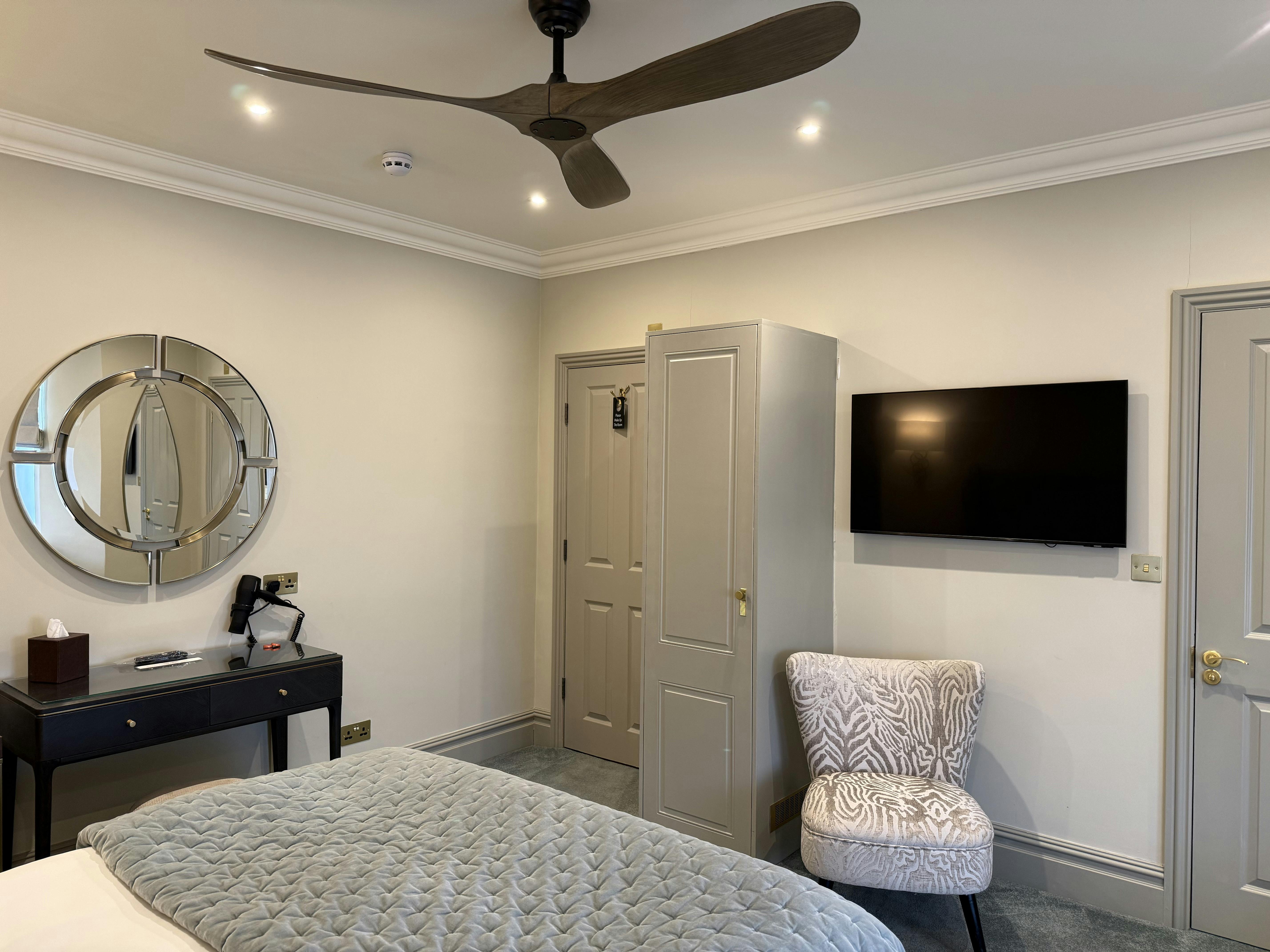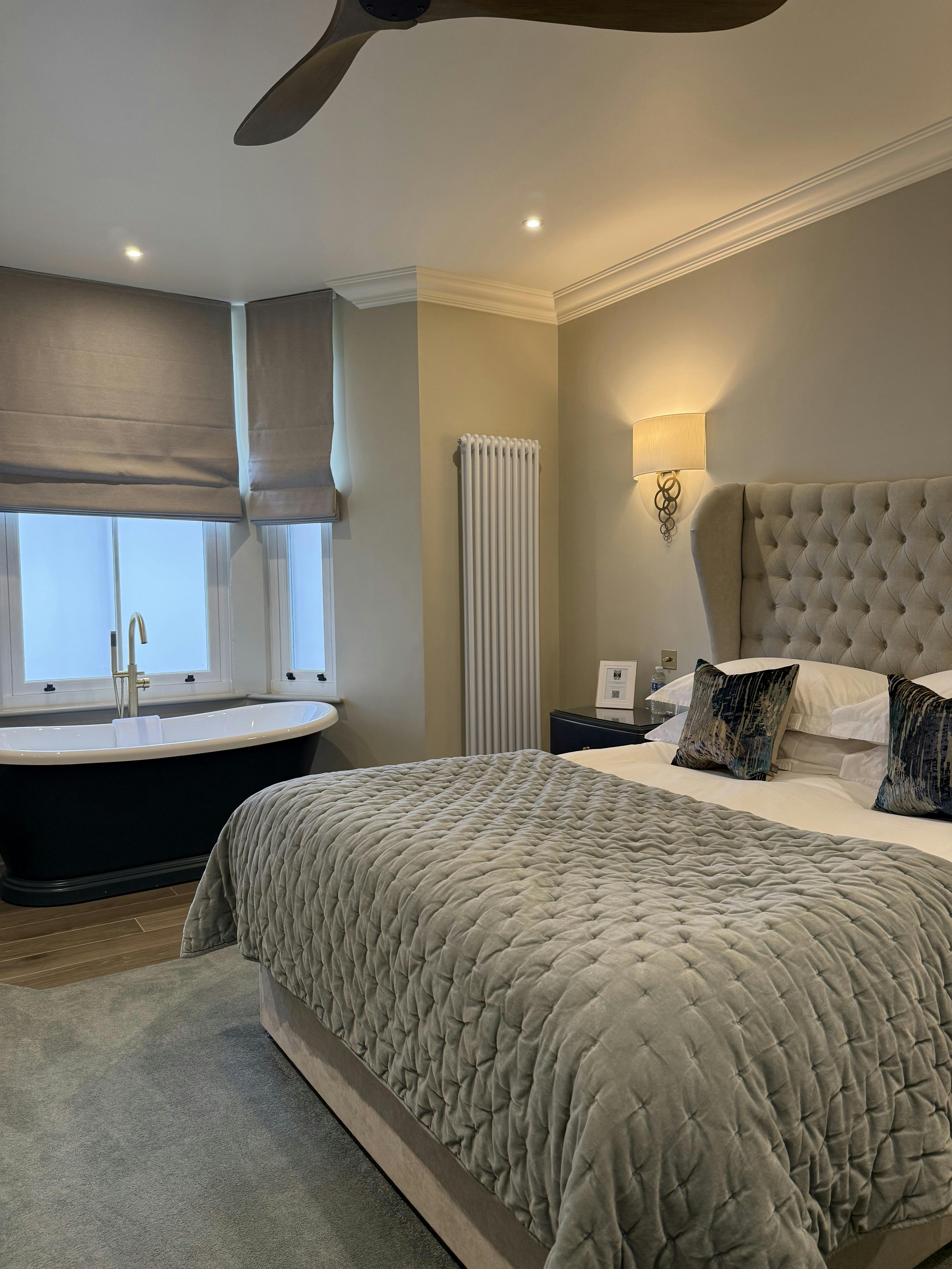 Together with a "Hypnos" king size bed, the room also offers a free standing roll-top bath in the bedroom for the extra indulgence. A spacious private en-suite shower room with a large walk-in shower and classic sanitaryware adorned with on-trend brushed brass fittings. The wooden propellor ceiling fan will keep you cool during those hot summer nights and will evoke a tropical ambience.